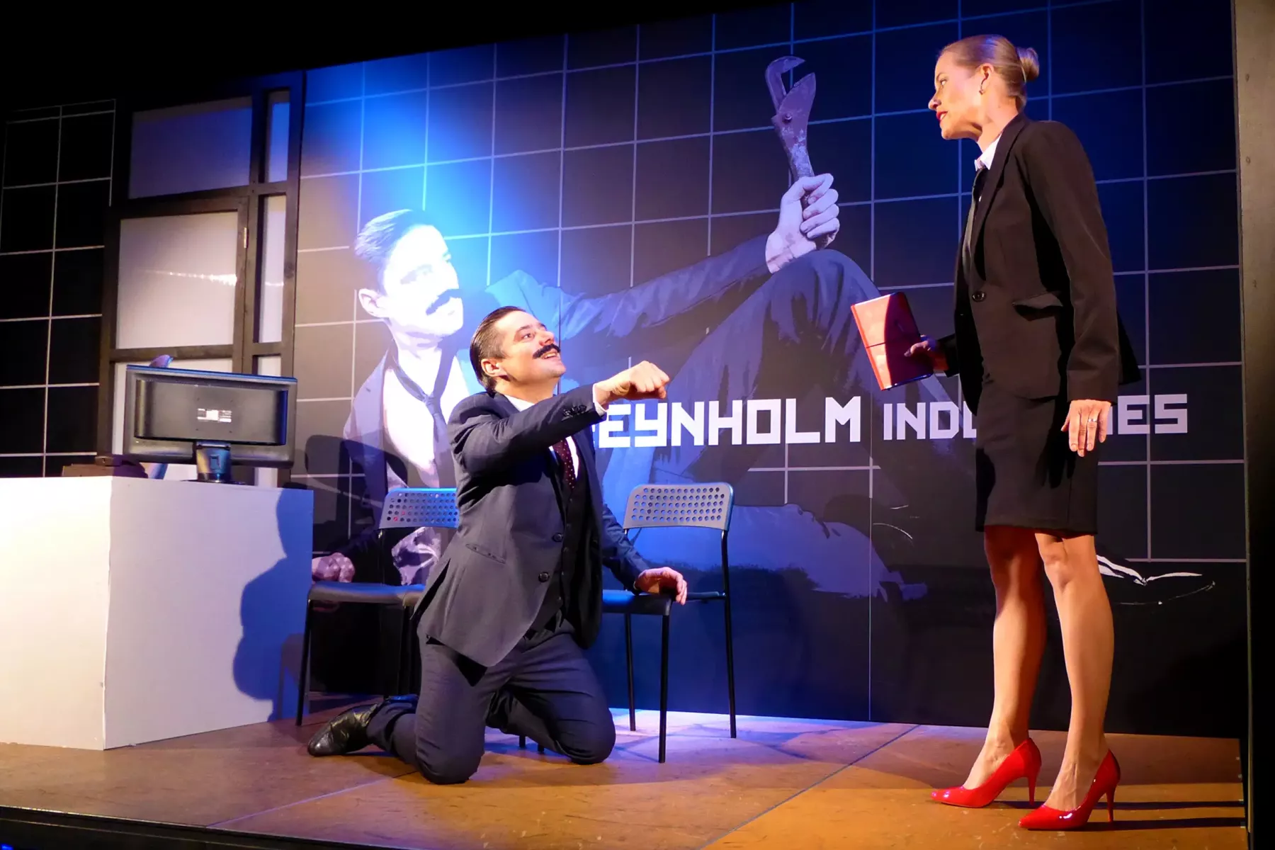 Ocenila jsem, jakým způsobem byla vytvořená scéna, na kterou se toho vešlo opravdu požehnaně. Srdce jeviště sloužilo jako I.T. oddělení, tedy takový bunkr našich hlavních hrdinů. Kromě počítačů tam měli také poličku s různými předměty a všude tam vládl takový správně kreativní nepořádek. Nad tím pak vzniklo ještě jedno patro, kde měl kancelář Douglas a kde pořádal různé briefingy, meetingy, brainstormingy apod.