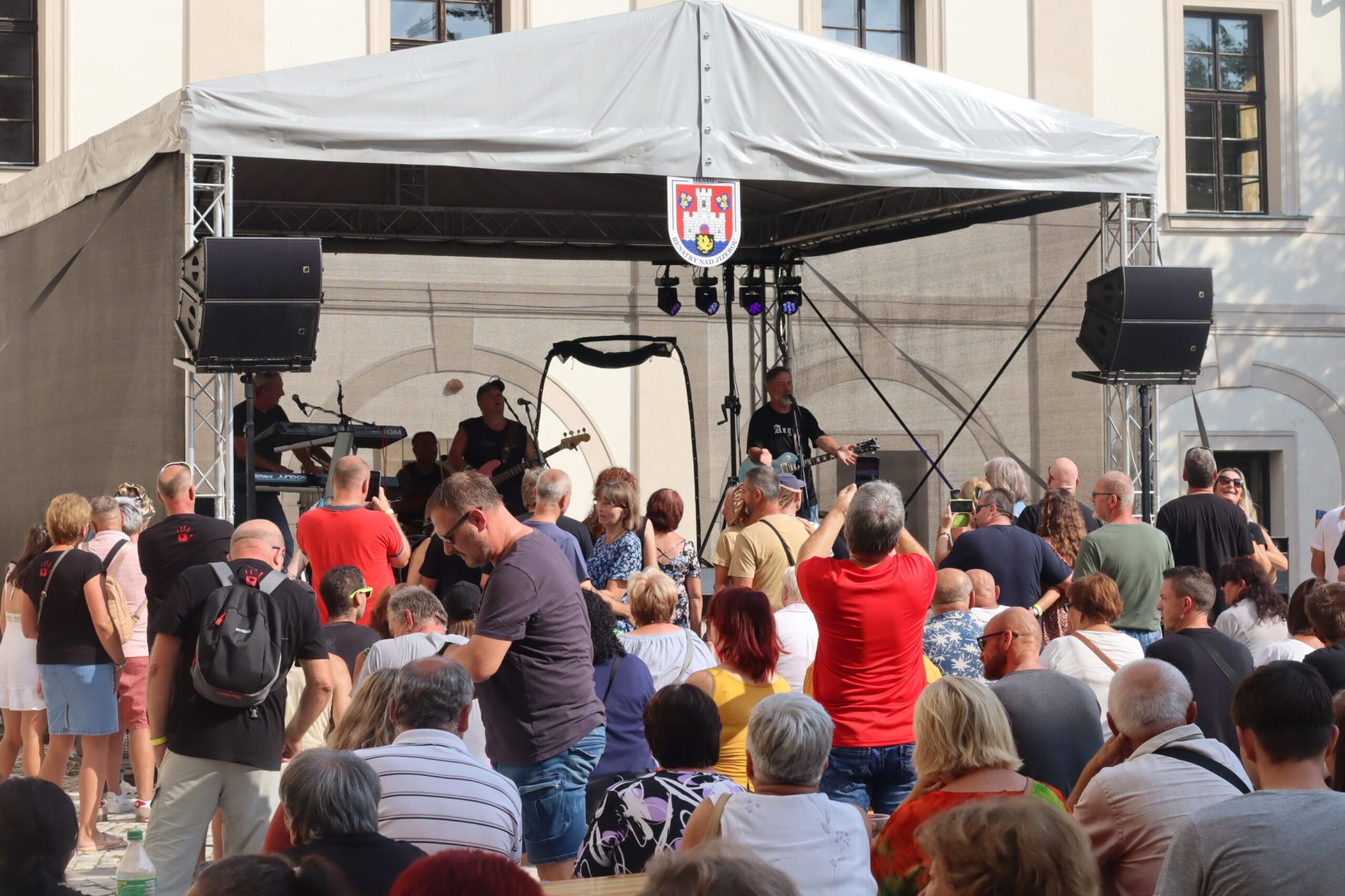 Nádvoří benáteckého zámku zaplnilo mnoho stolů, stánky s občerstvením a také velké podium, na němž Keks vystupuje. Posluchači se velmi dobře baví a pohupují se v rytmu známých melodií.