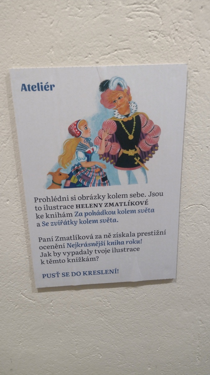 Pohádkový úvod jsem zvolila záměrně, protože i informační tabulky na výstavě jsou pojaté v tomto duchu – dozvíme se z nich něco málo o životě české malířky a ilustrátorky, jedná se ale vždy jen o taková krátká vyprávění. Výstava Helena Zmatlíková dětem – 100 let je zkrátka koncipovaná pro celé rodiny, a tak info stihne načerpat i rodič velmi aktivního dítka, co chvíli nepostojí na místě. Kdepak písmenka, daleko větší důraz je zde logicky na obrázky. Najdete tu knížky v různých jazycích, na nichž Helena Zmatlíková, rozená Wehrbergerová, pracovala, i jednotlivé ilustrace. Její barevné a veselé postavy tu mají i jako dekorace na zdech. V jedné z místností je zvuková kulisa ptačího zpěvu, což, musím říct, působí ve spojení s pohádkovými ilustracemi, velmi uklidňujícím dojmem.