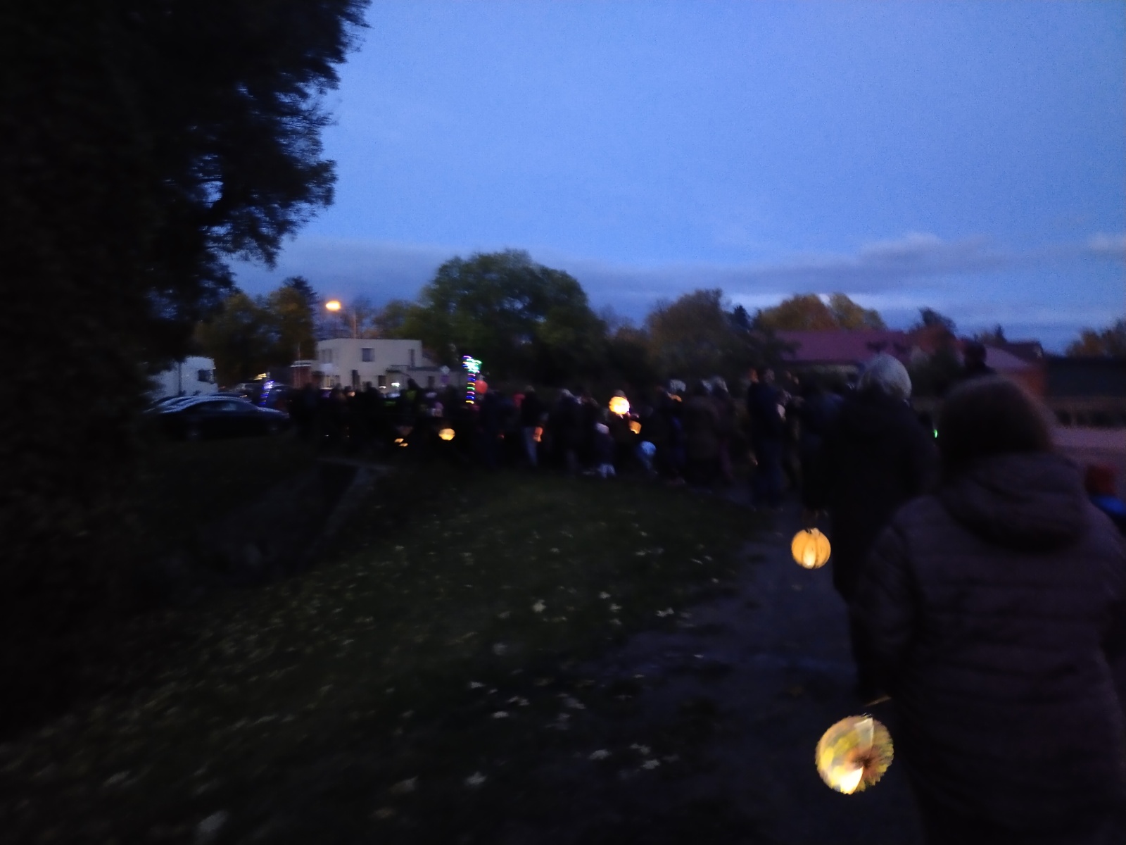 Účastnící průvodu se sešli v zahradě zámku už v šest hodin večer. Podle našeho mínění se tu mohlo sejít několik stovek lidí z blízkého i dalekého okolí, kteří byli parádně vybaveni. Řada z nich měla opravdové lampiony, ale i další světýlka, který si věšeli na bundy, nebo jen tak kolem krku a objevila se také jedna opravdová svítící medúza.