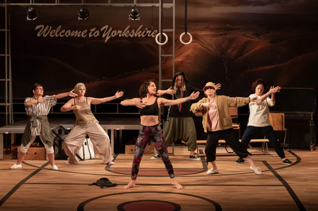 Ale zpět k představení. O scénu se postaral Michal Syrový, a jelikož nomen omen platí, tak scéna byla skutečně syrová, ale příjemným způsobem. Vystačili jsme si totiž obvykle s jedním prostředím, jakousi tělocvičnou, kde se dámy v rámci svého spolku scházejí. Na obou stranách jeviště to bylo naznačeno typickými dřevěnými obklady, vlevo jsem snad viděla i nějaké ty žebřiny, vpravo jsou dveře, u nichž je důležité, že se otevírají směrem dovnitř, takže člověk musí táhnout k sobě, ne naopak. Zadní stěnu pak nahradilo pozadí, naznačující přírodní krásy Yorkshireu. Pro jistotu je zde i světelný nápis Welcome in Yorkshire, stylem připomínající neonové názvy amerických dinerů. Nápis se mi líbil moc, pozadí už o něco méně, protože ze zadní části hlediště to působilo spíše jako nějaká americká krajina. Čekala bych spíše více zeleně na těch kopcích. Ale na tom zas tak nezáleží, hlavně že nechybělo nic důležitého – třeba vyvýšená plošina, představující jeviště. Atmosféru dokreslovalo také piano, na které jedna z postav hraje. Občas to vypadá, že umí jenom jednu písničku, kterou nabízí pořád dokola, ale to je jenom zdání, jak se dozvíme v závěru.