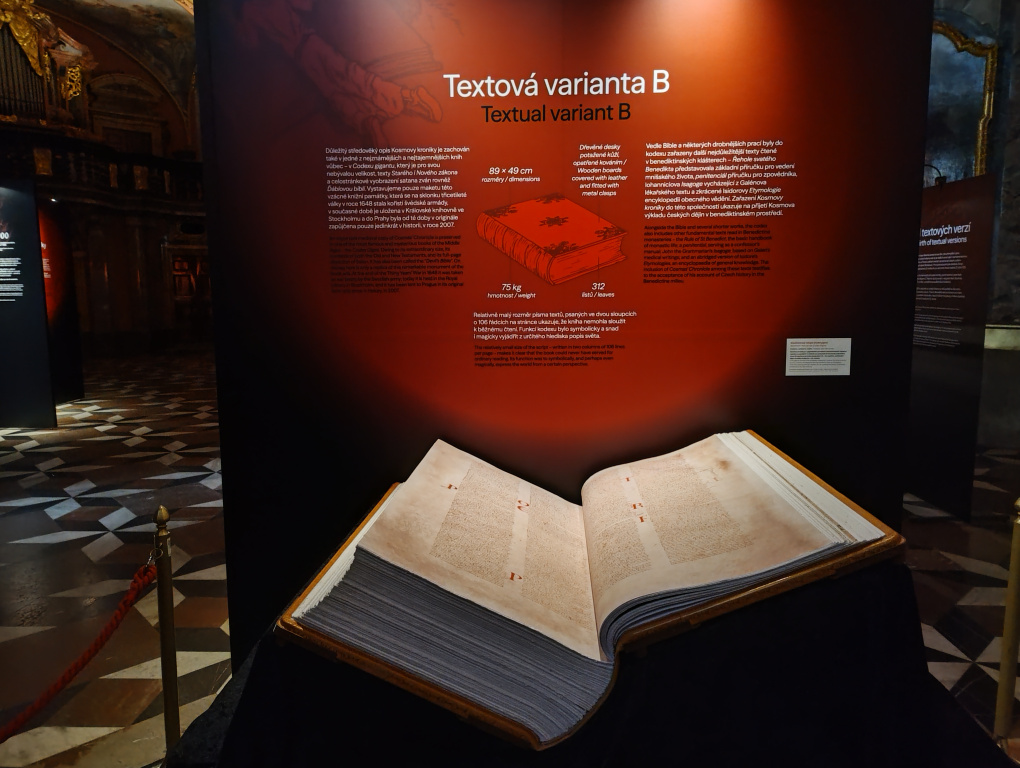 Samotná výstava, ač v nádherném prostředí, je v podstatě poměrně skromná, pár informačních panelů, v nichž se dočtete o jednotlivých verzích a přepisech Kosmovy kroniky. Připomenete si, kde vznikaly a jak se od sebe liší. Většinou se rodily pod rukou mnichů v benediktinských klášterech. Někde se při práci zaměřili třeba jen na určité období, jindy si k textu přidali také vlastní dodatek, ať už něco dalšího z historie či třeba pravidla života v klášteře.