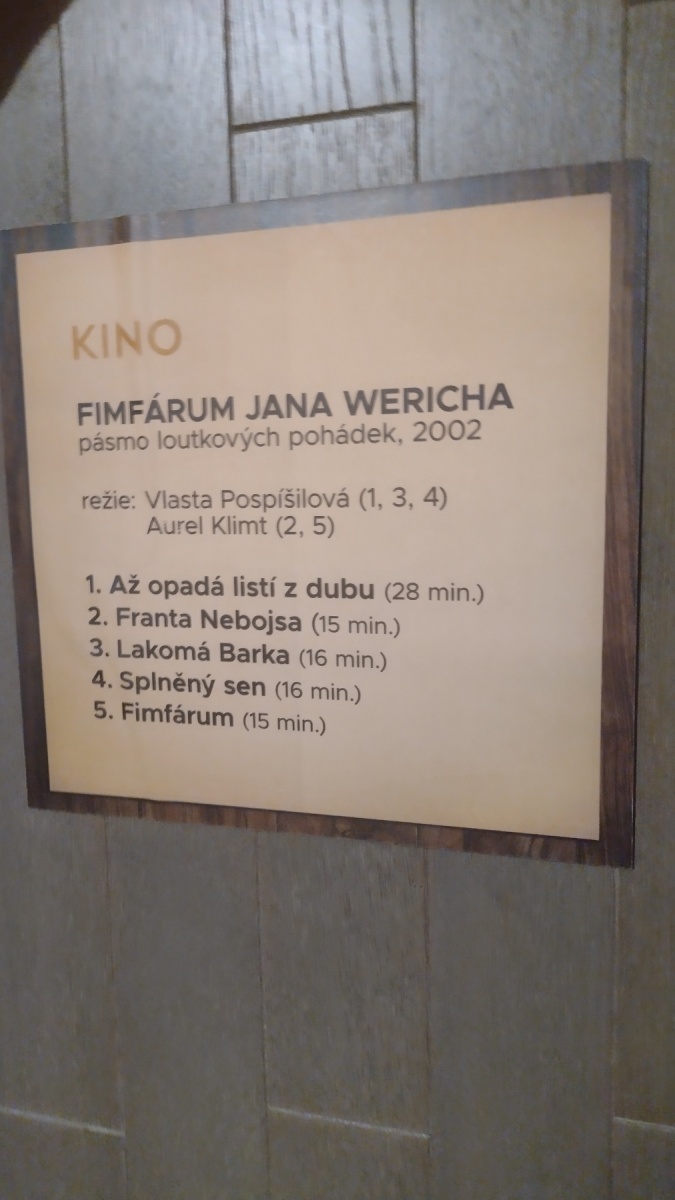Právě Fimfáru se věnuje zmíněná výstava, která na Chvalech zůstane do konce letních prázdnin, tedy do 31.8. Především si zde můžete prohlédnout loutky, které si ve zmíněných filmech zahrály. Není bez zajímavosti, že ačkoliv Werich zemřel již v roce 1980, tedy dávno před vznikem filmových verzí Fimfára, přesto byl jejich součástí. A to díky hlasovému doprovodu – do filmů byly totiž využity zvukové nahrávky z 60. let, kdy Werich pohádky namluvil na gramofonové desky. Dnes bychom to nazvali načítání audioknih, ovšem na výstavě jsem se dočetla i velice zajímavý prvopočátek toho všeho. Co stálo za vznikem první desky s nahrávkou O rybáři a jeho ženě a kdo ji dostal k Vánocům?