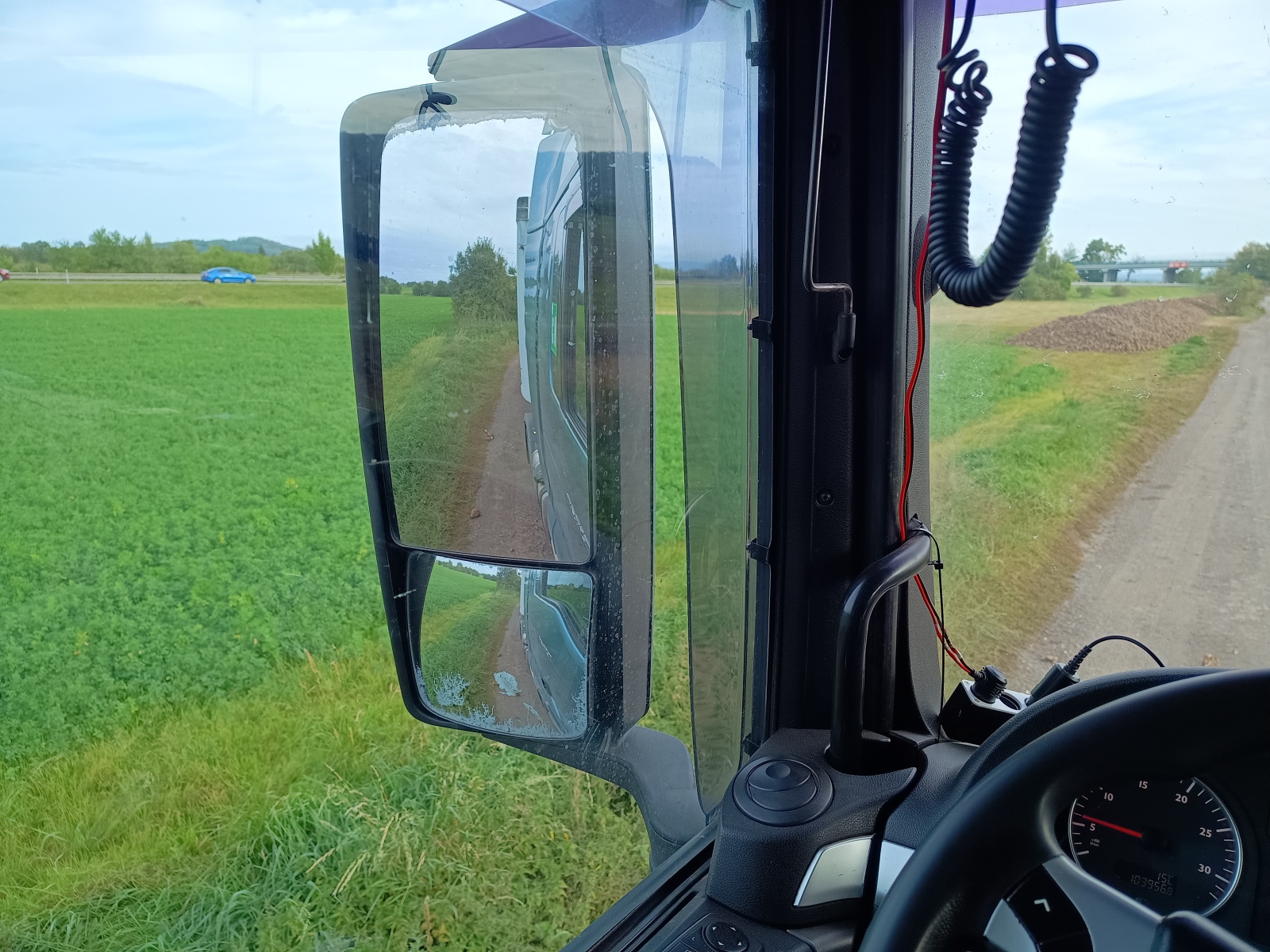 Ještě pohledy do zrcátek, ať vidíte, co vše řidič kamionu (ne)vidí. Levá strana je relativně přehledná, ale stejně má mnohem větší slepé úhly, než osobní auto. Například není vidět 6 metrů za návěs, takže se tam schová klidně celé auto. A konec návěsu ve vzdálenosti 17 metrů od řidiče se též neodhaduje úplně jednoduše, tomu ale naštěstí pomáhají poziční "tykadýlka"