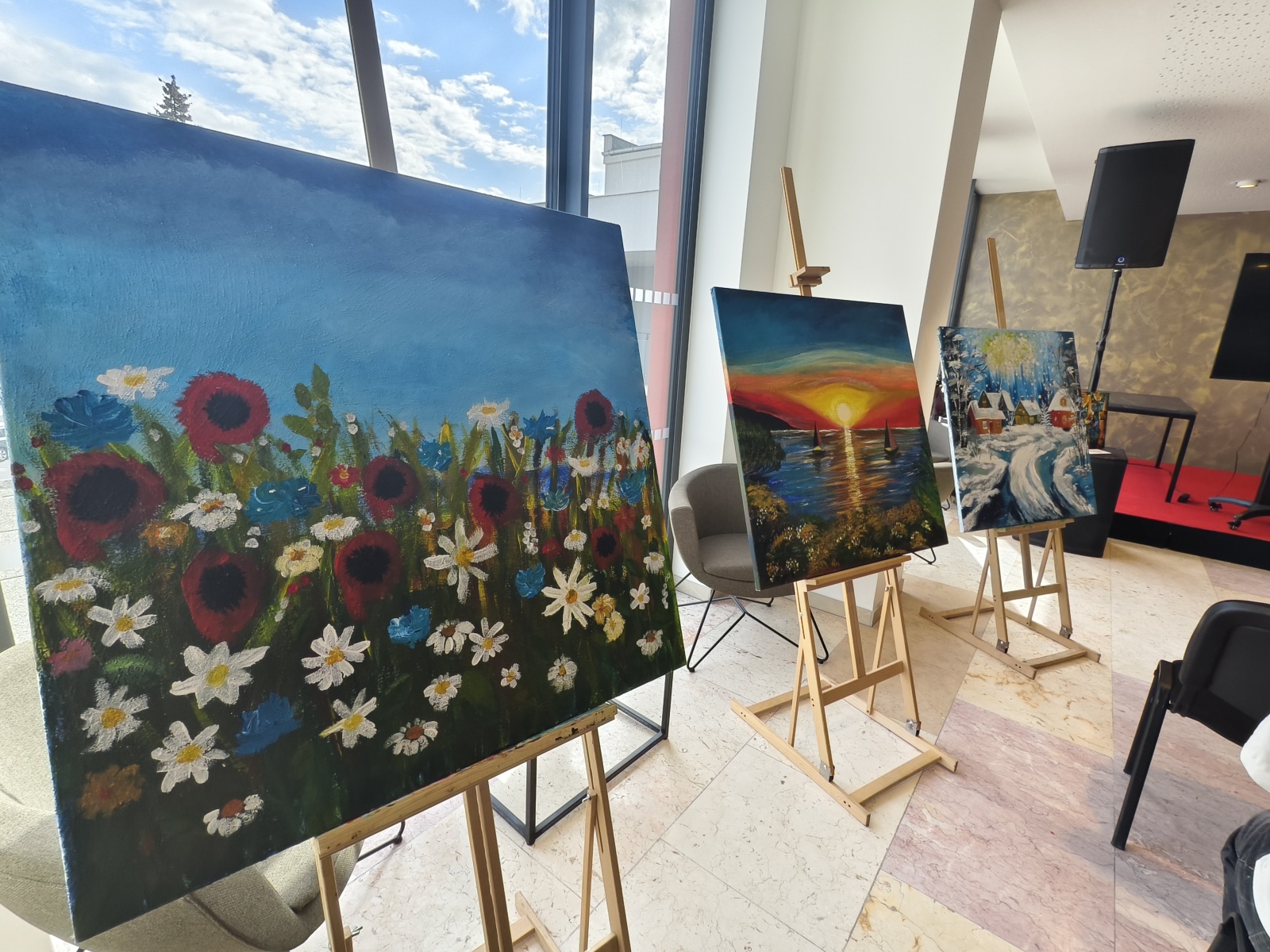 Žasnu nad šikovností všech, kteří na obrazech pracovali. Opravdu parádní díla. A potom přichází na řadu překvapení. Tři velká plátna, která vytvářeli žáci školy spolu s klienty Domova Mladá. Je to Jarní louka, Léto s loďkami a Zima s chaloupkami. Na zimu si myslím, ale už dopředu se obávám, že to bude nad mé možnosti. A taky že jo, nakonec se vydraží za cenu přesahující tři tisíce korun. Nádhera!
