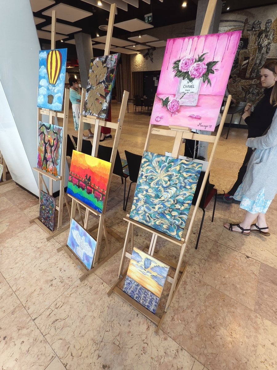 Je čtvrtek odpoledne a já přicházím do KD Milovice. Aukce začíná v 17 hodin, jsem tady dřív a prohlížím si vystavené obrazy. Všechny vytvářeli žáci Základní školy TGM Milovice a také paní učitelka Valášková. Nemohu říct malovali, neb byla použita široká škála technik tvorby.