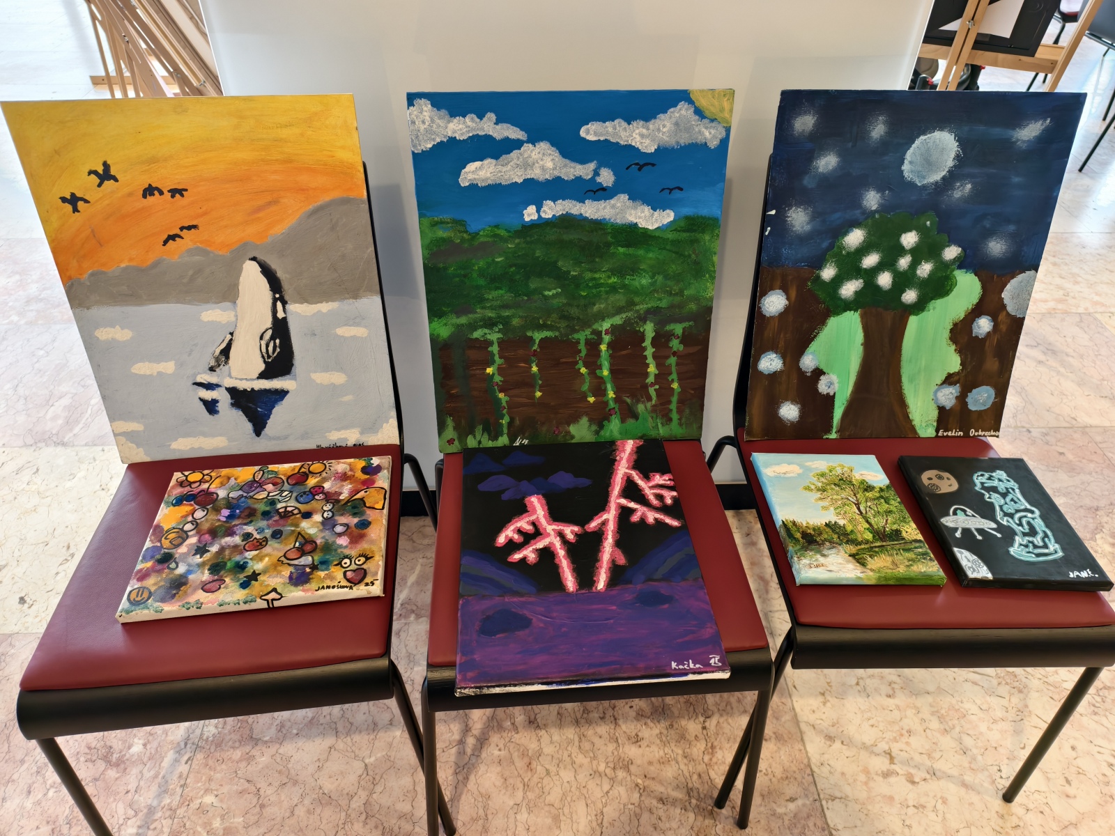 Je čtvrtek odpoledne a já přicházím do KD Milovice. Aukce začíná v 17 hodin, jsem tady dřív a prohlížím si vystavené obrazy. Všechny vytvářeli žáci Základní školy TGM Milovice a také paní učitelka Valášková. Nemohu říct malovali, neb byla použita široká škála technik tvorby.