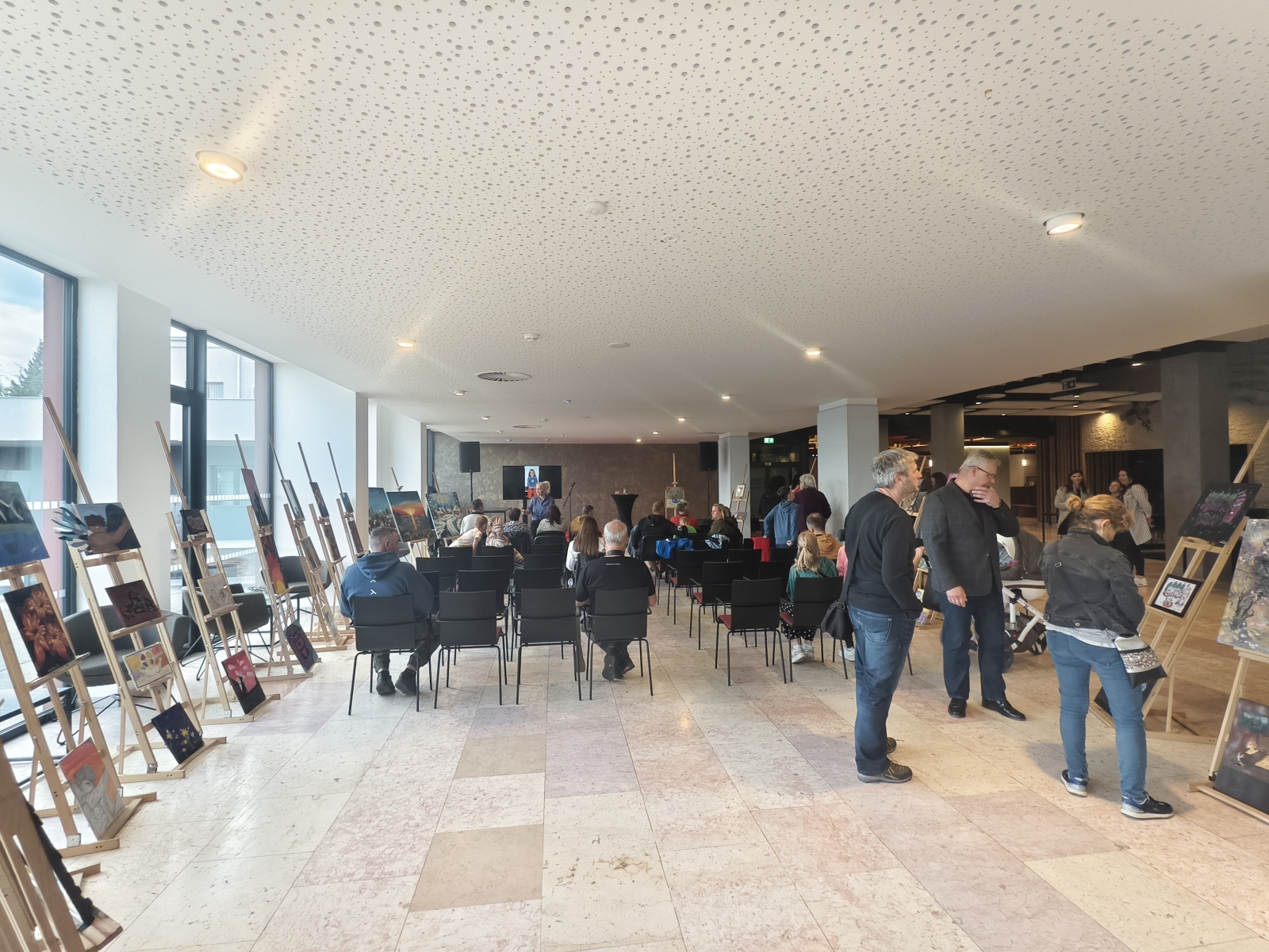Je čtvrtek odpoledne a já přicházím do KD Milovice. Aukce začíná v 17 hodin, jsem tady dřív a prohlížím si vystavené obrazy. Všechny vytvářeli žáci Základní školy TGM Milovice a také paní učitelka Valášková. Nemohu říct malovali, neb byla použita široká škála technik tvorby.