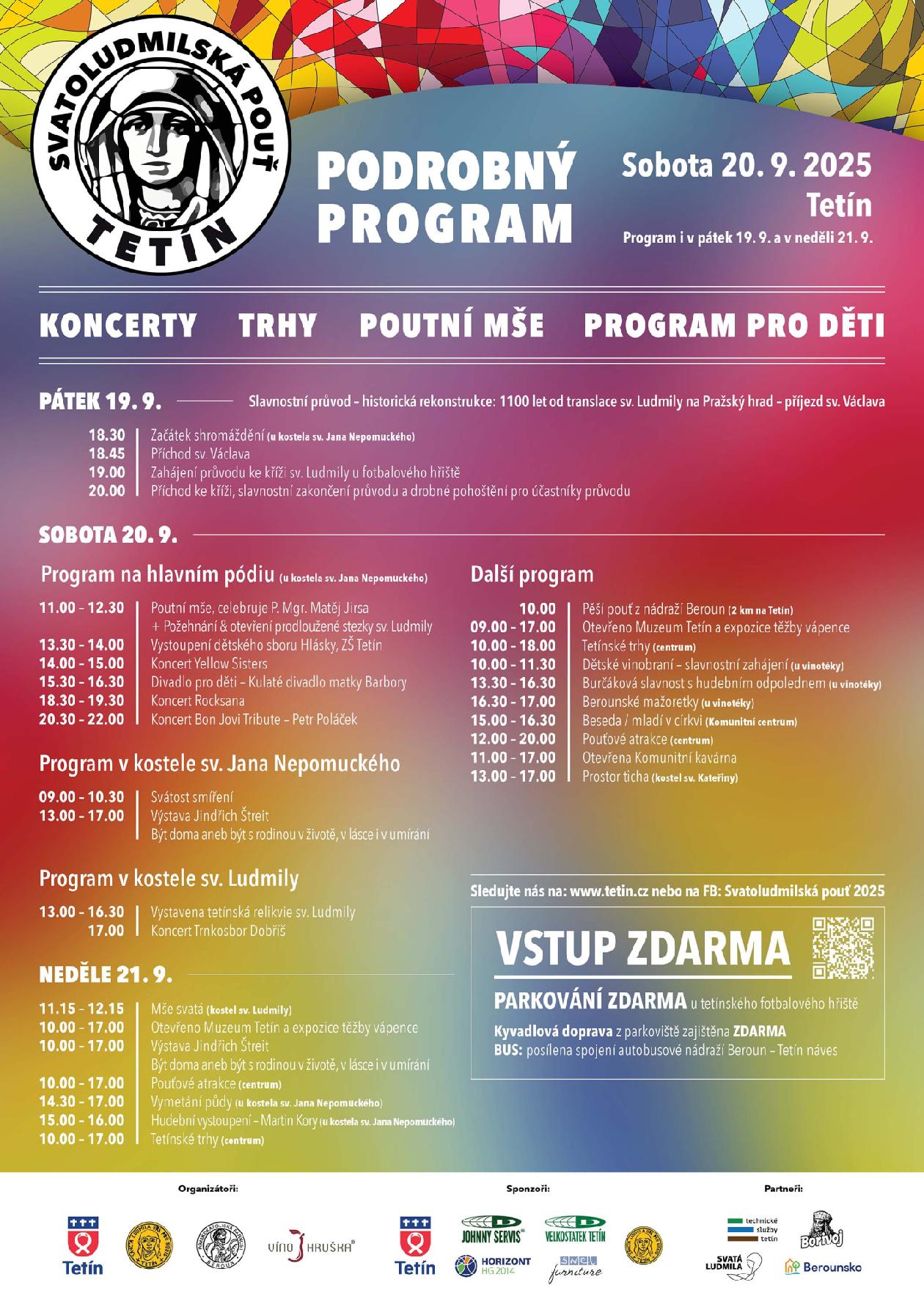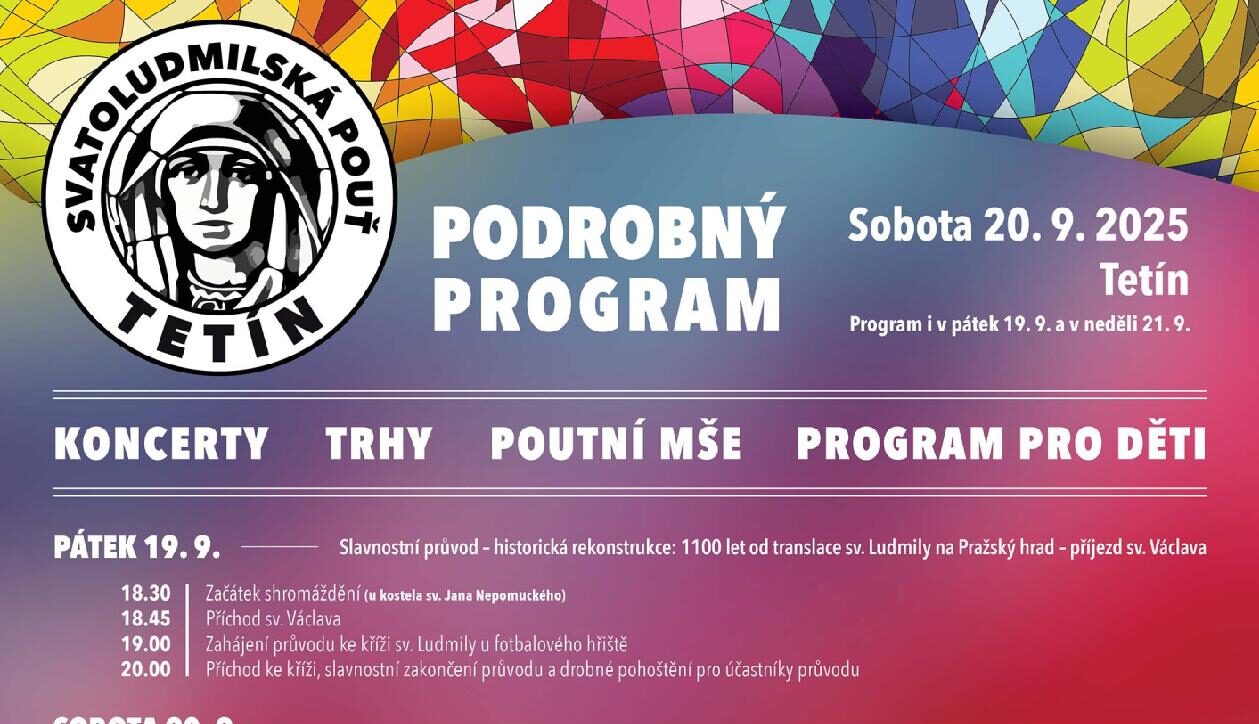 V sobotu 20. září pak oslavy pokračují dopolední mší (11.00) a otevřením konce nové Stezky sv. Ludmily. Zájemci si mohou prohlédnout také tetínskou relikvii sv. Ludmily. Chybět nebude ani koncert, pouťové atrakce a divadlo pro děti, ani další bohatý doprovodný program, který bude pokračovat i během celého dne v neděli 21. září (přiložen podrobný leták).
