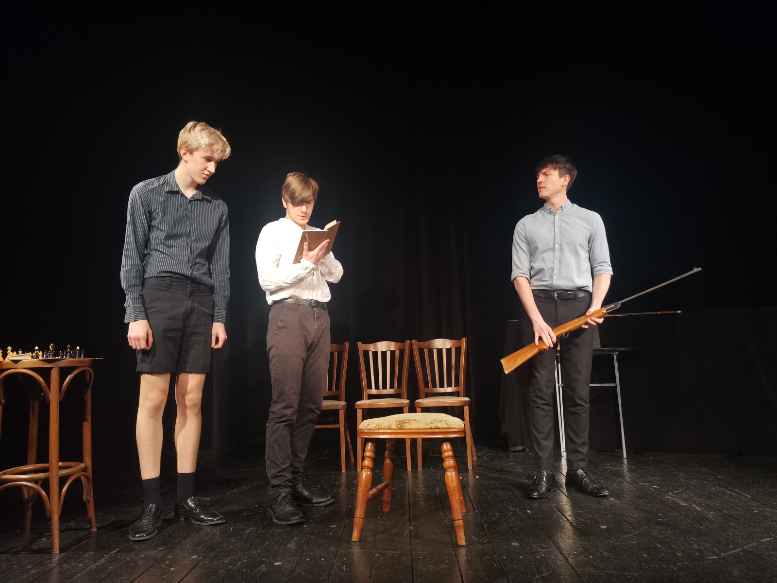 Co se týče rekvizit, vaše pozornost jistě ulpí především na šachovnici, která tam není jen na okrasu, ale má vícero funkcí. Jednoduché a skromné jsou též kostýmy, přesto se podařilo každou figuru nějak ozvláštnit a charakterizovat ji i pomocí oblečení.