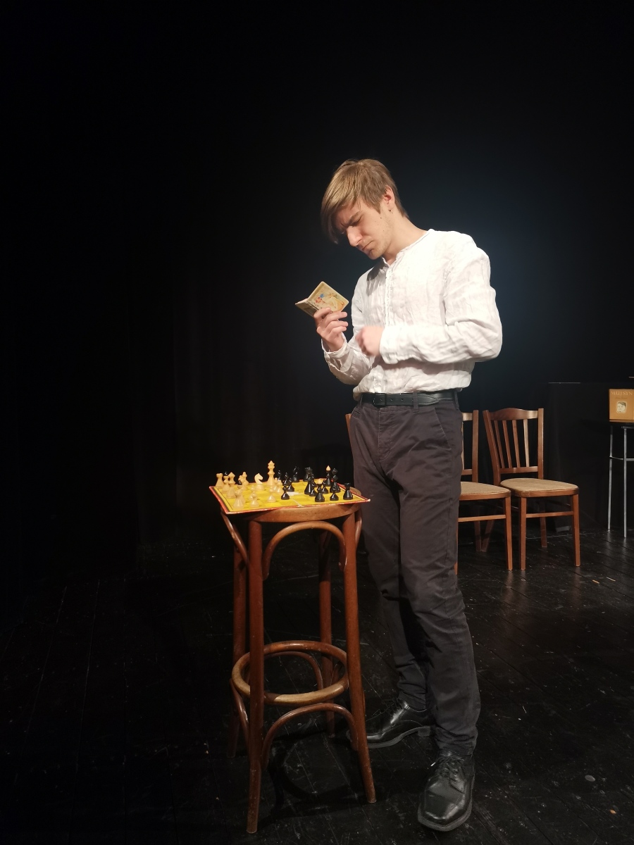 Co se týče rekvizit, vaše pozornost jistě ulpí především na šachovnici, která tam není jen na okrasu, ale má vícero funkcí. Jednoduché a skromné jsou též kostýmy, přesto se podařilo každou figuru nějak ozvláštnit a charakterizovat ji i pomocí oblečení.