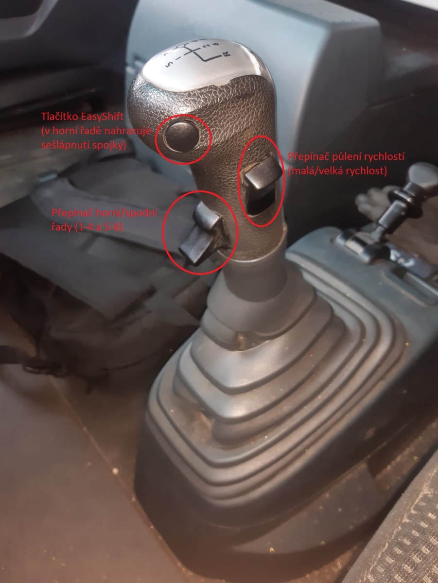 Řadicí páka u kamionu MAN TGX s přepínačem řad převodů (dole spodní, nahoře horní), přepínačem půlení převodů (dole "malá" rychlost, nahoře "velká rychlost") a tlačítkem umožňující řazení bez použití spojky. Všechny přepínače fungují jako předvolba, tedy musím je navolit před sešlápnutím spojky/stisknutím tlačítka, pouze pohyb řadicí páky je potřeba dělat při sešláplé spojce/stisklém tlačítku.
