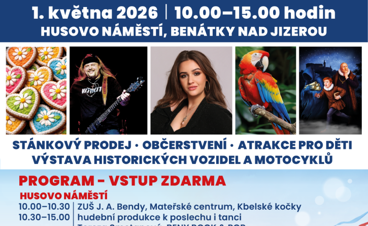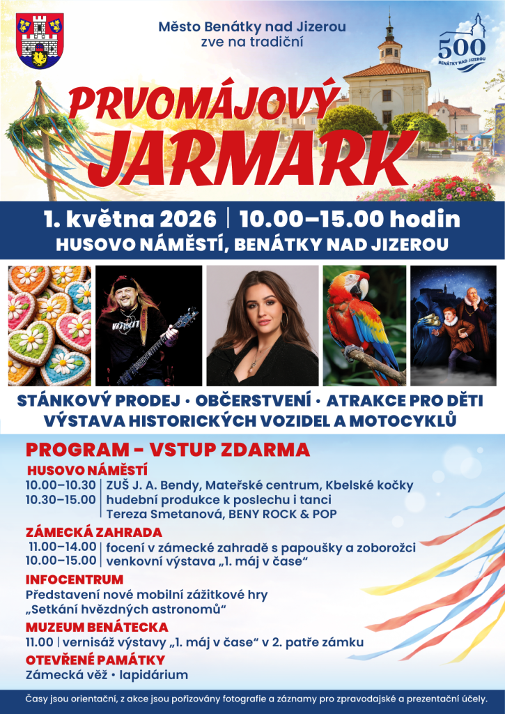 První máj v Benátkách nad Jizerou bude i v roce 2026 patřit tradičnímu jarmarku, který každoročně přitahuje místní obyvatele i návštěvníky z širokého okolí. Prvomájový jarmark se uskuteční v pátek 1. května 2026 od 10:00 hodin na Husově náměstí, kde vytvoří příjemnou atmosféru plnou řemesel, kultury a jarní pohody.