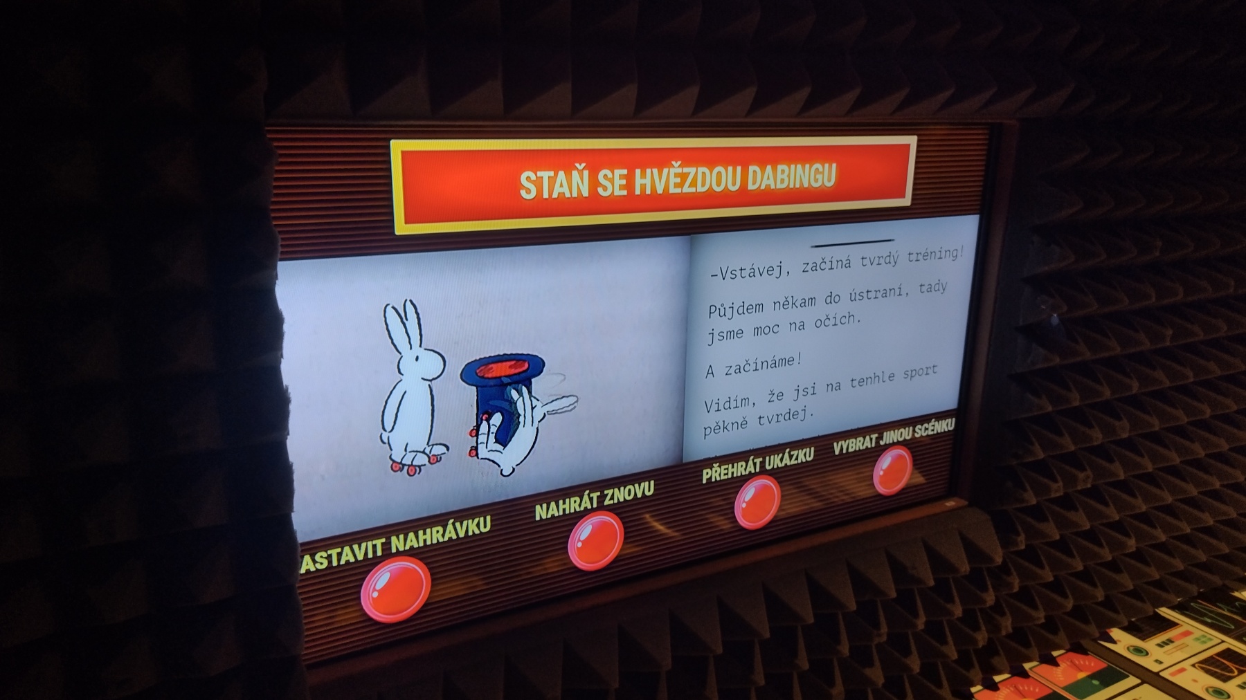 Osobně jsem trochu nadšenec do dabingu, takže mě přirozeně nejvíc táhla možnost si zkusit něco nadabovat. Tato možnost zde sice byla, hlas jste mohli propůjčit třeba králíkům z klobouku, Hurvínkovi či Maxipsu Fíkovi a Áje. Dokonce jsme viděli, že jednoho tatínka to tak bavilo, že si pomalu ani nevšiml, že mu synek už odběhl do další místnosti. Bohužel když jsem byla na řadě já, obraz i zvuk se neuvěřitelně sekal, takže výsledek nebyl moc dobrý. Od kamarádky, která výstavu navštívila již nějaký čas přede mnou, jsem zase slyšela, že v jejím případě toto malé dabingové studio nefungovalo vůbec.