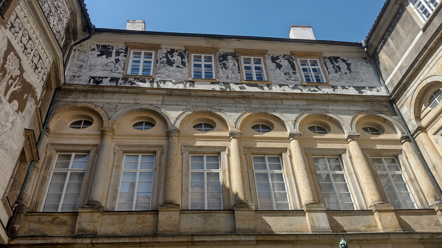 Vstupenky jsou k dostání na pokladně, což byla kdysi kancelář hofmistra, průvodci si vás vyzvednou na nádvoří a posléze toho projdete poměrně dost, a to jak severní křídlo, tak i západní či východní. Už ze začátku poznáte, že výraznou stopu zde zanechali Habsburkové, jejichž majestátní znak visí u schodiště, v místě, kde možná kdysi stála komnata samotného císaře. Nejprve nahlédneme do habsburského sálu a později i do tzv. Rudolfovy síně. Mimo jiné se dozvíme, že za Rudolfa II. byl Brandýs dokonce i královským komorním městem. Když tedy v pohádce Císařův pekař a pekařův císař volal „Hopsa hejsa do Brandejsa“, bylo na tom přece jen něco pravdy. Z doby Rudolfa se také dochovala některá sgrafita, další sgrafitová psaníčka jsou pak renesanční.